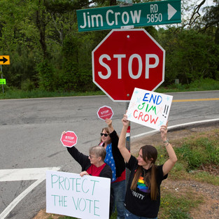 GA 9th District Democratic Women's Network making a little bit of good trouble at Jim Crow Road in Hall County, protesting the restrictive voting laws passed in GA known at Jim Crow 2.0. There is an effort to rename the road, originally named after a local "Jim Crow" not related to the racist-law-promoting Jim Crow. But the signs are still there and the connection between the refusal to rename the road and the new voting laws rings loud and clear. Hall County is in the GA 9th congressional district, one of the most Republican-leaning districts in the nation. #stopjimcrow2